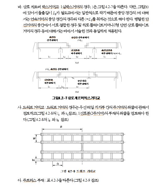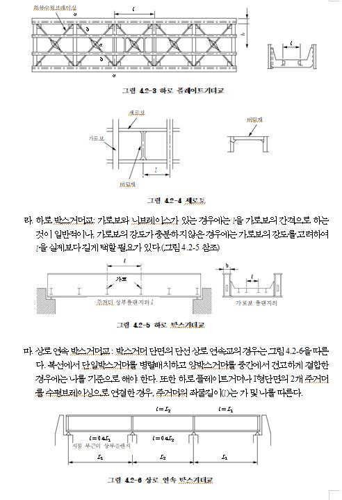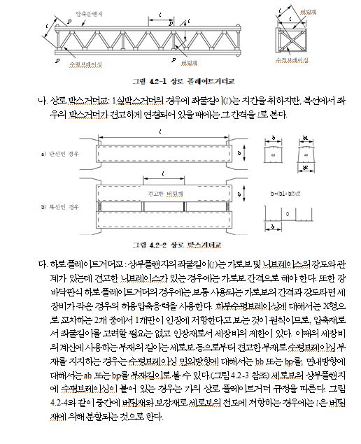 나. 상로트러스에서 가로보 위에 세로보를 놓는 경우에는 그 교차점 구성에 대하여 충분한 주의가 필요하다. 또, 현재의 길이가 변화하면 수평브레이싱에도 응력이 생겨 2차응력을 발생시키므로 수평브레이싱의 강성 등에 관해서도 고려해야 한다.(4.7.2 및 4.7.3 참조)