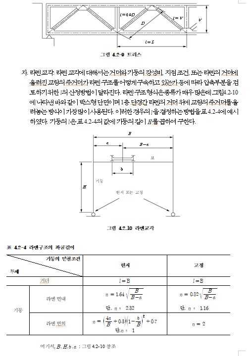 나. 인장재의 경우 인장력이 작용할 때의 편심은 작게 되는 경향이 있으므로 부재가 특별히 길지 않는 한 그다지 문제되지는 않지만, 압축재에서는 편심이 점점 증가하고 압축강도를 저하시키므로 바람직하지 못하다. 또, 열차통과에 의한 진동이 생기기 쉽고 피로의 측면에서 보아서도 바람직하지 못하다. 따라서 응력에 여유가 있는 경우라도 너무 세장비가 큰 부재를 사용해서는 안 된다.