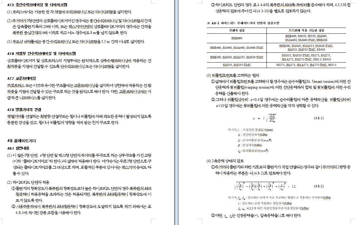 ② 부모멘트 구역뿐만 아니라 추가로 정모멘트 구역 플레이트거더의 상부 플랜지에 대해서도 4.7의 규정에 따라 브레이싱을 설치하고 길이에 관계없이 모든 하부플랜지에는 연속 횡방향 브레이싱을 설치한다.