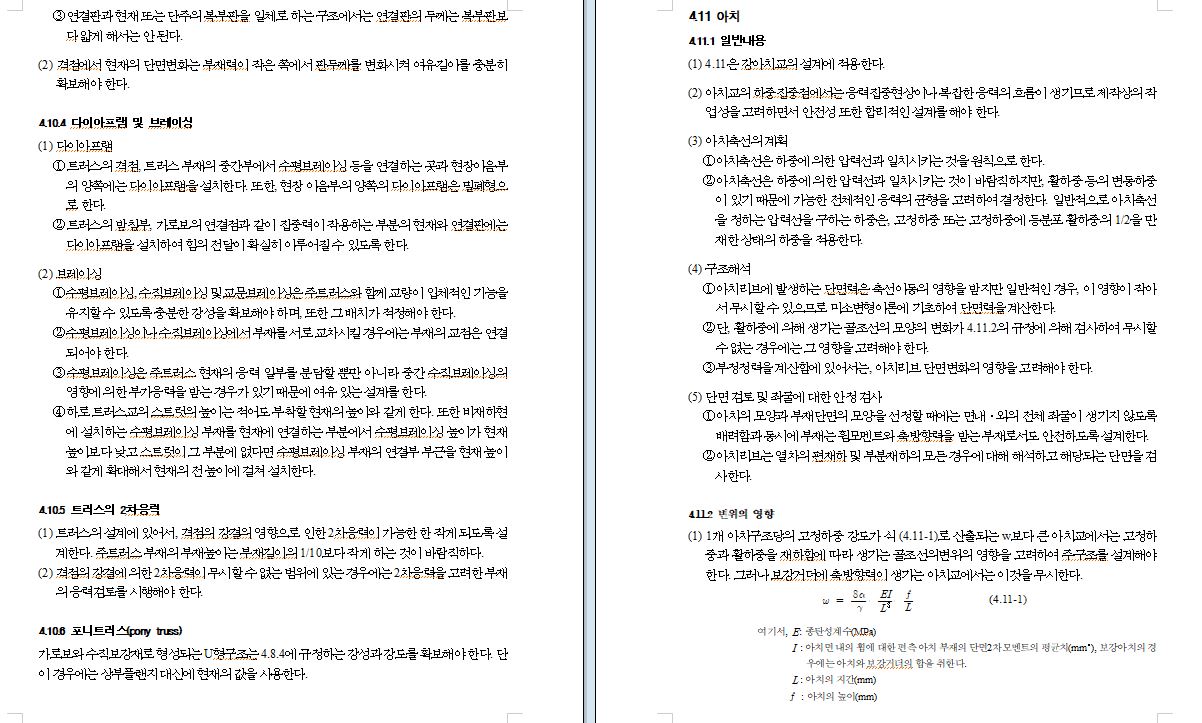 가. 일반 트러스에서는 격점을 회전이 자유로운 힌지로 생각해서 축방향 응력만으로 설계하는 것이 보통이다. 그러나 격점을 힌지로 본 결합 트러스도 핀 결합부분의 녹 등에 의해서 마찰이 증가하고 상당한 2차응력이 발생되며, 특히 격점이 리벳 또는 고장력볼트 결합의 경우는 거의 강결의 상태에 있어 큰 2차응력을 발생시킬 수 있으므로 이에 대한 검토를 해야 한다.