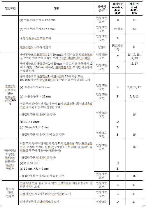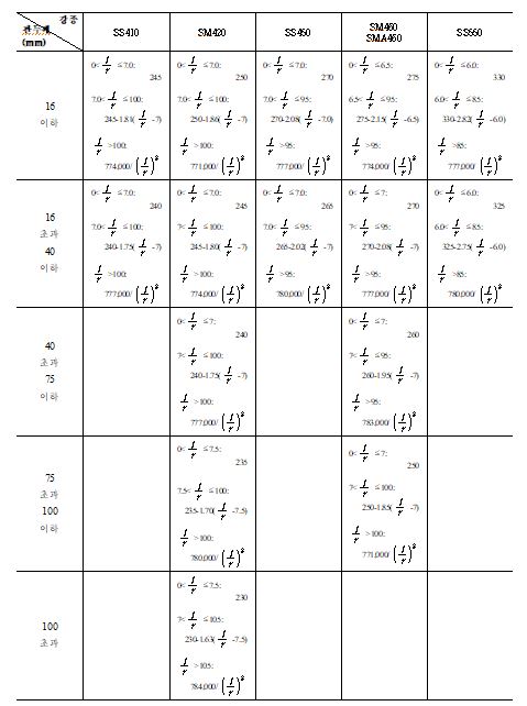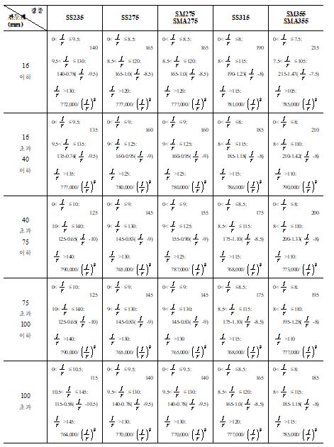 | 필릿용접 | 비드방향의 인장, 압축응력 | 16이하 | 165 | 215 | 250 | 275 | ⑥ | ||||||||