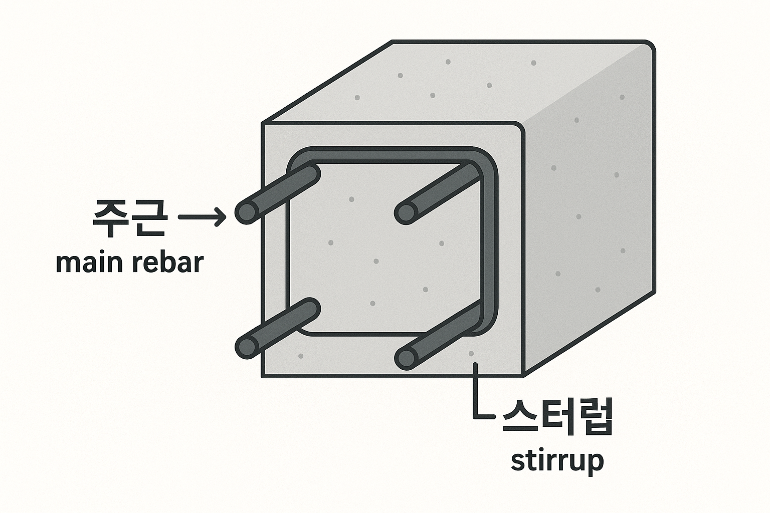 “스터럽(Stirrup)”은 철근콘크리트 구조물에서 사용하는 보조 철근입니다. 쉽게 설명드릴게요: